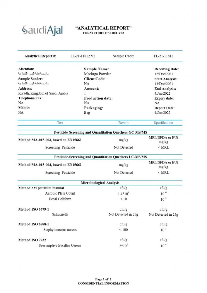 مسحوق مكون من أوراق المورينجا المجففة وهو عبارة عن مكمل غذائي طبيعي يستخدم للعديد من الأغراض المرضية وبغرض الوقاية أيضًا، حيث يعتبر طبيعيًا بنسبة 100%، كما أن المنتج مرخص من هيئة الغذاء والدواء السعودية ويمكن استخدامه على الأطعمة والمشروبات أيضًا.